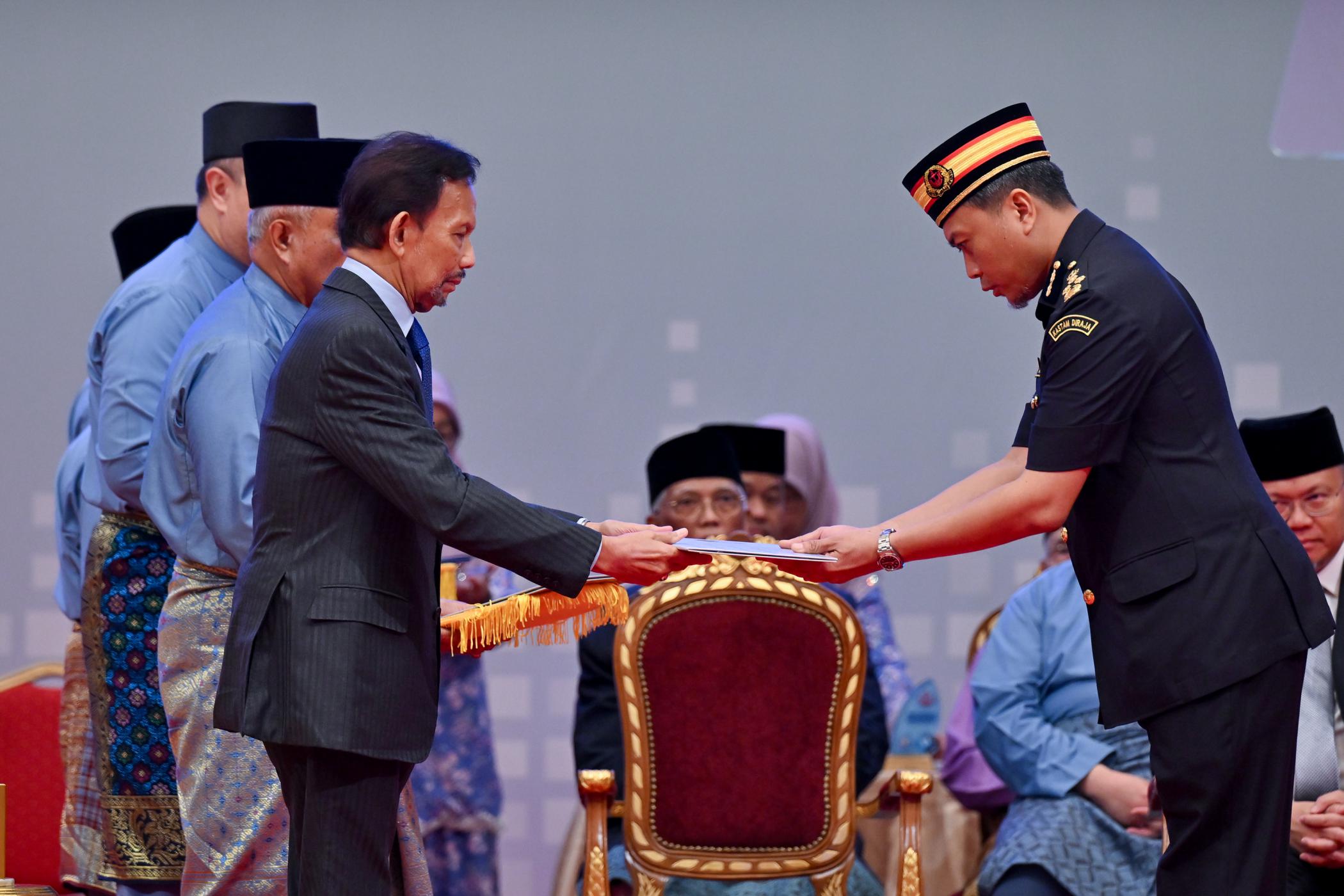 KDYMM Paduka Seri Baginda Sultan Haji Hassanal Bolkiah Mu’izzaddin Waddaulah berkenan mengurniakan Sijil Pengiktirafan Penggredan Prestasi Sektor Awam (3PSA) Melalui Penarafan Bintang kepada Yang Mulia Awang Muhammad Azizil Hakim bin Haji Brahim, Pemangku Pengawal Kastam dan Eksais Diraja, Jabatan Kastam dan Eksais Diraja, Kementerian Kewangan dan Ekonomi– Gambar daripada Jabatan Penerangan.